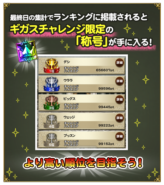 ※ギガスチャレンジ期間前から挑戦中だった場合、ギガスチャレンジ期間中に記録したスコアのみがチャレンジハイスコアの対象となり、期間前に記録していたスコアとは合算されません。