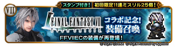 マスター神技付き装備「無銘【VIIEC】」や、タクティカル覚醒奥義、リミットブレイク・ソウルドライブ付き装備など、セフィロスのみがピックアップされた特別な装備召喚となり、装備召喚スタンプの報酬ではセフィロスのドレスレコード「神羅の英雄」などが獲得できます。