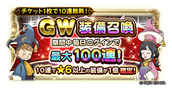 「GWログインボーナス」で獲得できる「GW装備召喚チケット」を使用して無料で実行することができる10連の装備召喚です。
