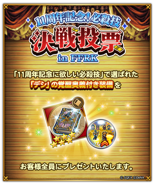 9月22日(月)に期間限定イベントとして開催していた「11周年記念!必殺技決戦投票 in FFRK」の投票報酬として、期間中にログインされたお客様全員に、デシの覚醒奥義付き装備「秘録「決戦投票」」をプレゼントいたします。