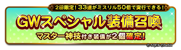 5月14日(木) 14:59までの期間中、「マスター神技」付き装備が2個確定の33連レア装備召喚を、ミスリル50個または2910ジェムで実行可能な装備召喚です。