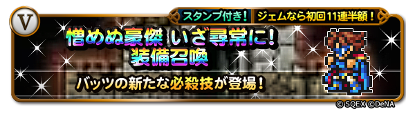 バッツのみがピックアップされた特別な装備召喚となり、装備召喚スタンプの報酬ではバッツのドレスレコード「青魔道士バッツ」などが獲得できます。