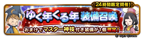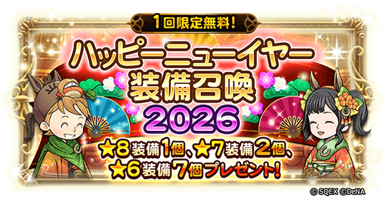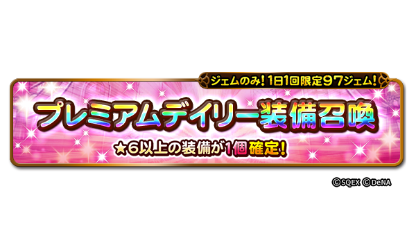 1月12日(月) 4:59まで、1日1回の期間限定★6以上の装備が1個確定のレア装備召喚を97ジェムで実行することができます!