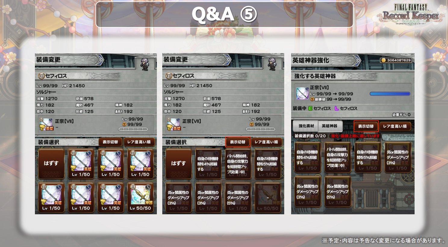 下記画面の「表示切替」を押すことで、表示内容を変更でき英雄神器の場合武器名・熟練度・装備可能英雄名・固有効果・継承効果をそれぞれ確認することができます。