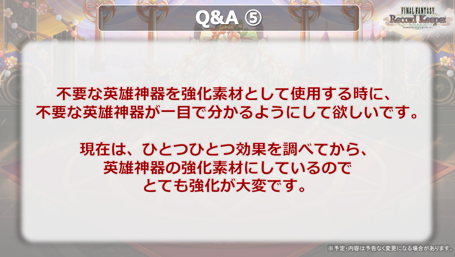 レコードボードで英雄神器が交換できるようになってから、不足しているお声をいただいておりますので、現在対応を検討しております。