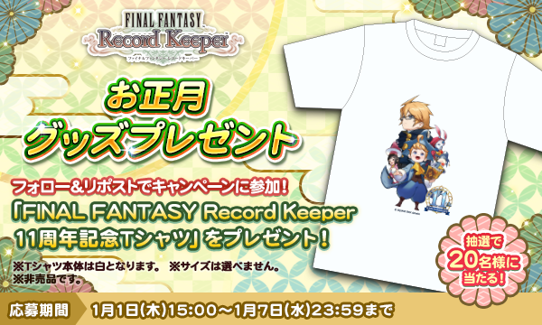 キャンペーンにご参加いただいた方から抽選で20名様に「FINAL FANTASY Record Keeper 11周年記念Tシャツ」をプレゼント!