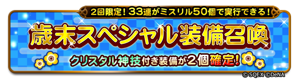 1月1日(木) 14:59までの期間中、「クリスタル神技」付き装備が2個確定の33連レア装備召喚を、ミスリル50個または2910ジェムで実行可能な装備召喚です。