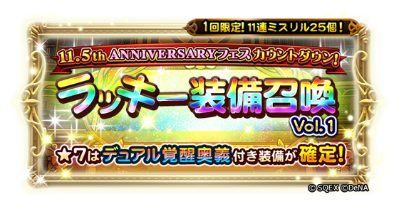 ▼3月17日(火)より、「11.5th ANNIVERSARYフェスカウントダウンラッキー装備召喚」が開催予定です。